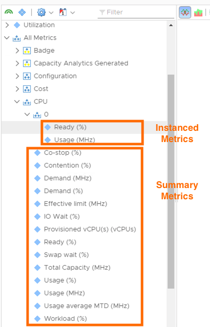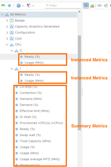 There are some parts of an objects configuration that differ for each instance of that object. For example, VM “ABC” might have one vCPU where as VM “DEF” might have 2 vCPUs. Although each machine will have the same metrics that summarise the whole objects performance/configuration for a given area (e.g. CPU Usage MHz) each CPU within a VMs configuration will also have its own metrics.