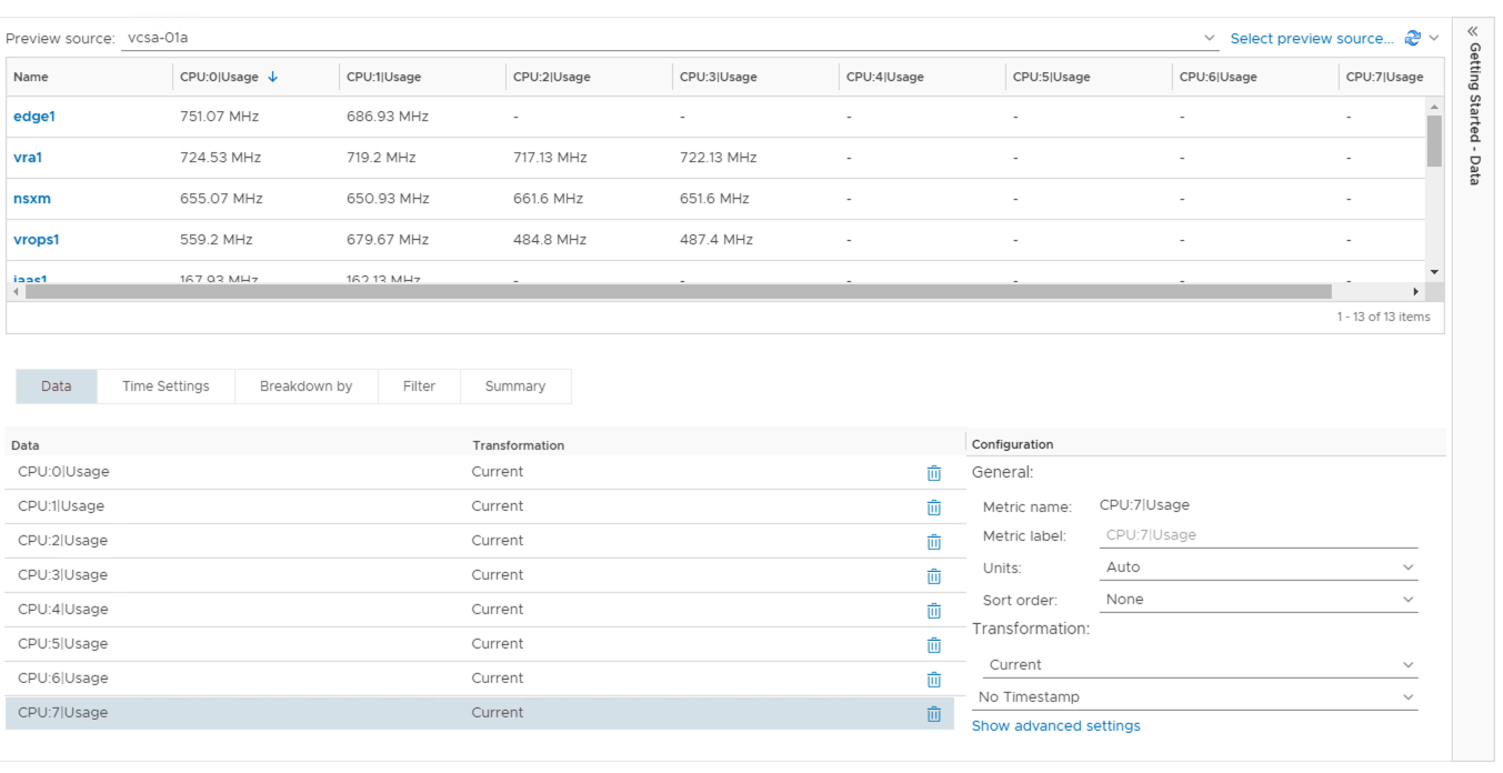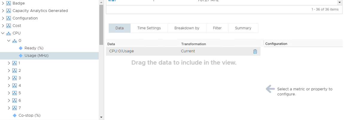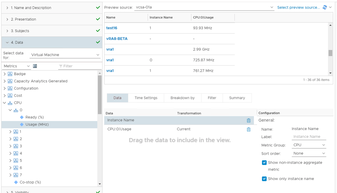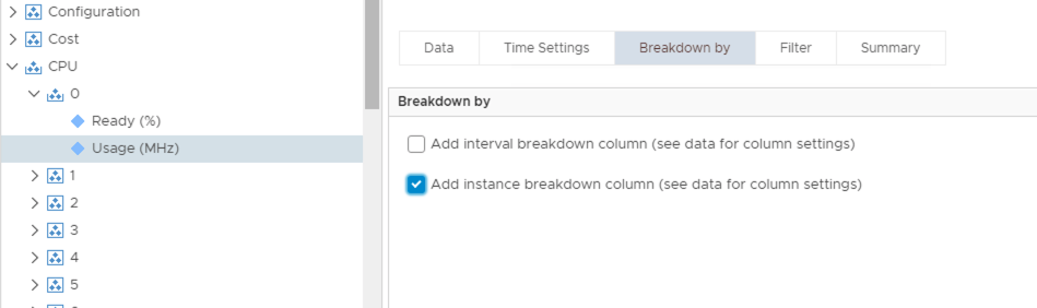 Another way to use instanced metrics within the view is to use the “Breakdown by” feature. This enables you to select an instanced metric when building the view and tell vROps to represent each instance of that metric as a new line item within the view table. In this case we are asking vROps to show each vCPU as a separate line item.