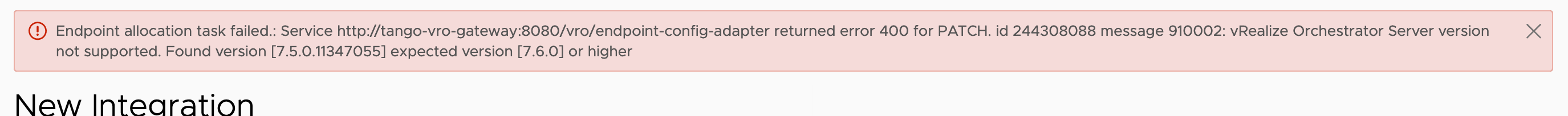 In order to connect in an on-prem vRO instance to Cloud Assembly you first need to have deployed that vRO instance. The link provided in “Connections > Integrations > Add Integration > vRealize Orchestrator” allows you to pull down an OVA file hosted on Amazons content distribution network. This image is customised as it includes a plugin for CAS (Cloud Services plugin). Unfortunately when i was writing this article the OVA file that comes down was version 7.5.0 and Cloud Assembly now requires 7.6.0 following a recent update. When you try to add an incompatible vRO version to Cloud Assembly you get an error similar to this: