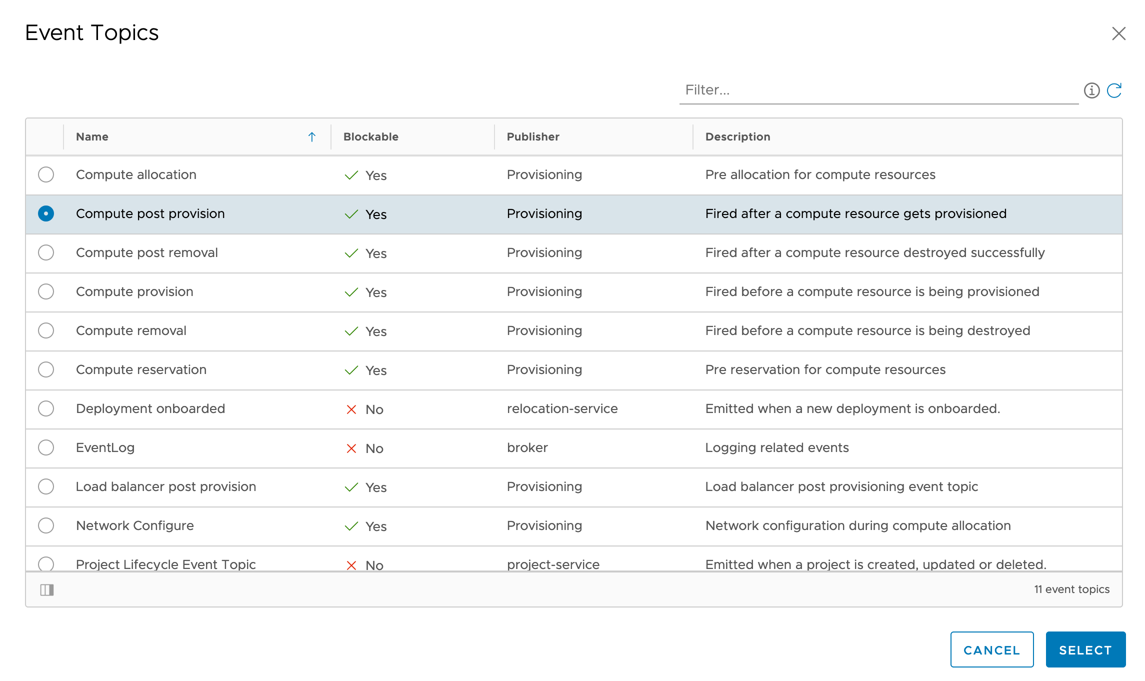 In this example I want to update tag information within Cloud Assembly once a machine has been built successfully so I will be using the “Compute Post Provision” topic. To see all the event topics available go to “Extensibility > Event Topics” and then select the event you are interested in.