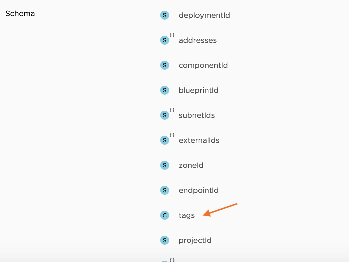 To start building out the workflow you need to create an empty workflow with a single properties input called “inputProperties”. The schema shows an attribute exists within the payload call “tags”. We can use this as an output for sending the tag information back to Cloud Assembly. A “c” or “complex” attribute shown in the schema is represented in a workflow as a properties object.