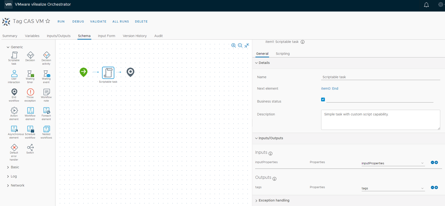 Here I have added a scriptable task to the workflow to allow me to implement some test code. The task takes the workflow input “inputProperties” in and returns the output “tags”, both of type “properties”.