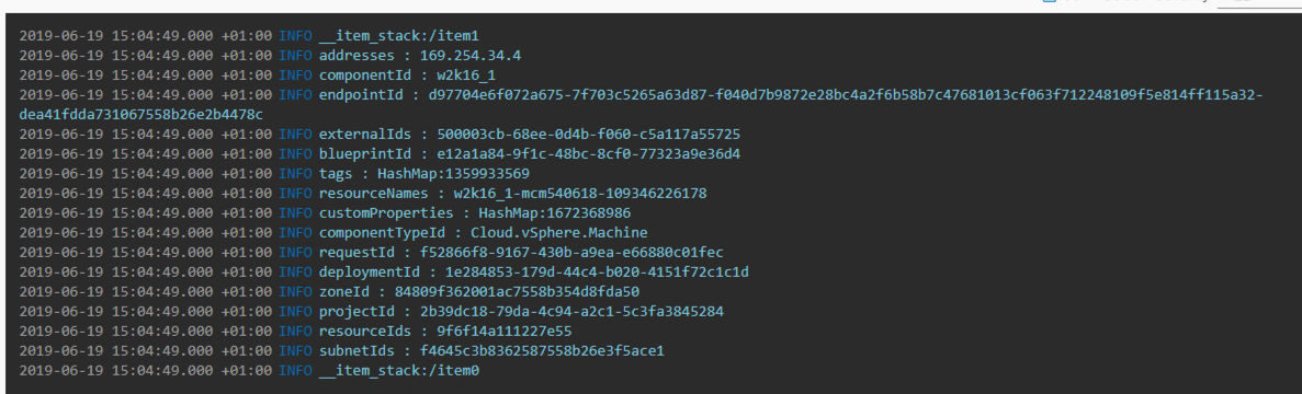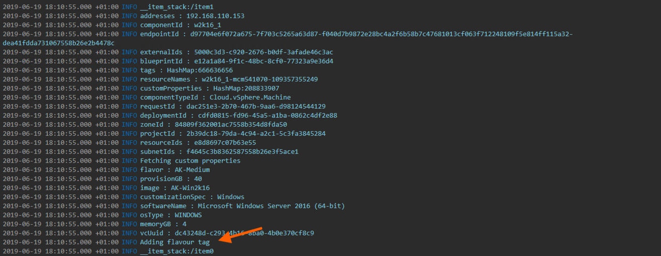 The output of a test deployment now gives more information. Everything from “Fetching Custom Properties” log entry onwards comes from the “customProperties” attribute. I now have access to the image flavour that was used to build the deployment and I will use this information to tag the machines deployed.