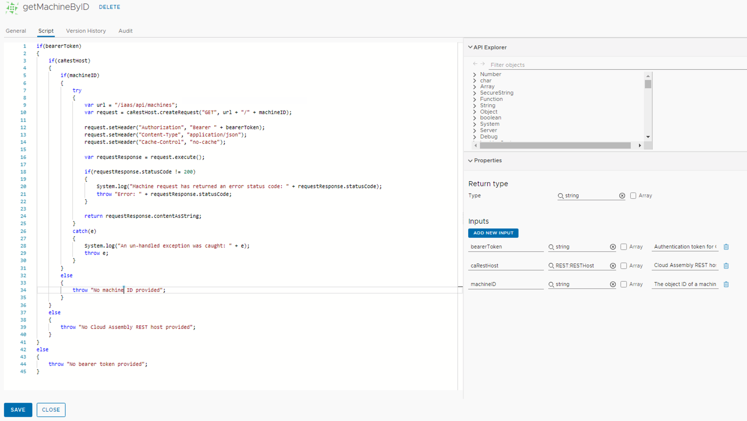 Using the above information we can create an API call within vRO to execute the request and fetch the machine details. As this seems like something I might re-use I will create it as an action.