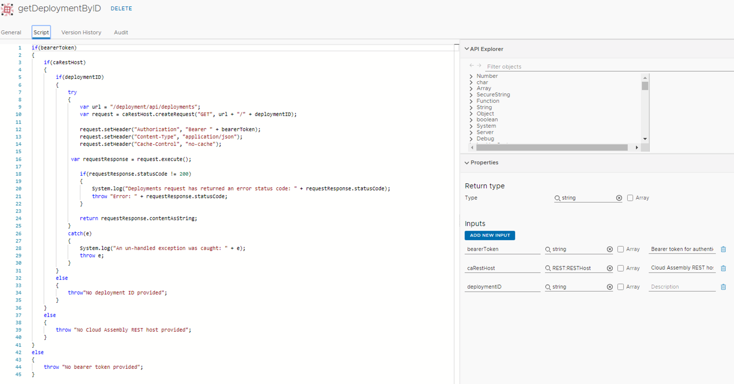 With the deployment ID extracted it can be passed to the API call. The code for the API call will be mostly the same as the machine API call (different URL and customized exception messages) and when dropped into an action looks like this:
