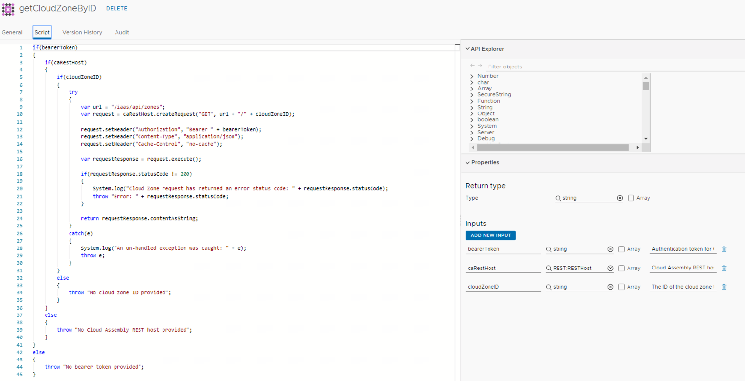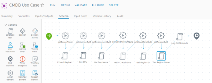 To supplement the vCenter hostname we are also going to fetch the region name so that we have sufficient information to populate the CMDB no matter whether the endpoint is on-prem or public cloud. This means fetching the cloud zone using its ID (we added the ID extraction from the event payload previously so we don’t need to modify anythign in the payload extraction script). Here’s the action to do that.