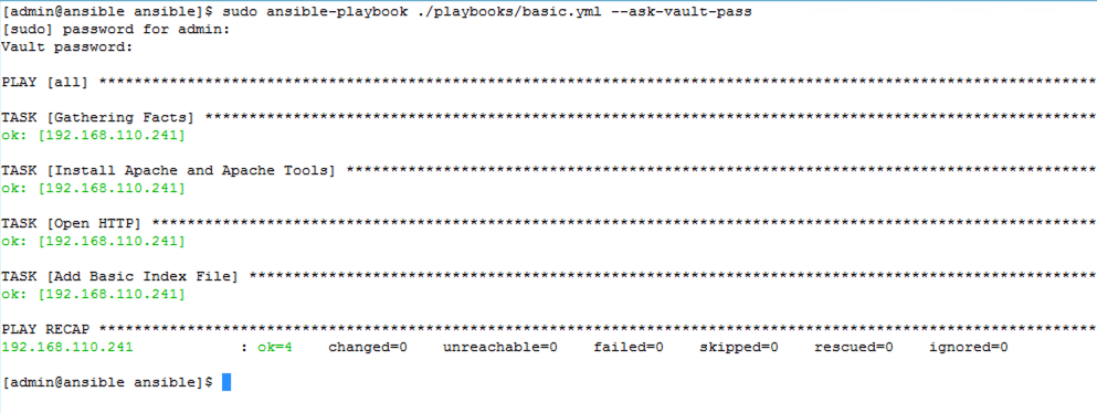 The last part of the puzzle is to de-encrypt the vault file when the Playbook is executed so that the password in the vault can be passed to the Playbook as it is executing as a variable. We do this by supplying the vault password as the Playbook is executed using the “–ask-vault-pass” parameter.