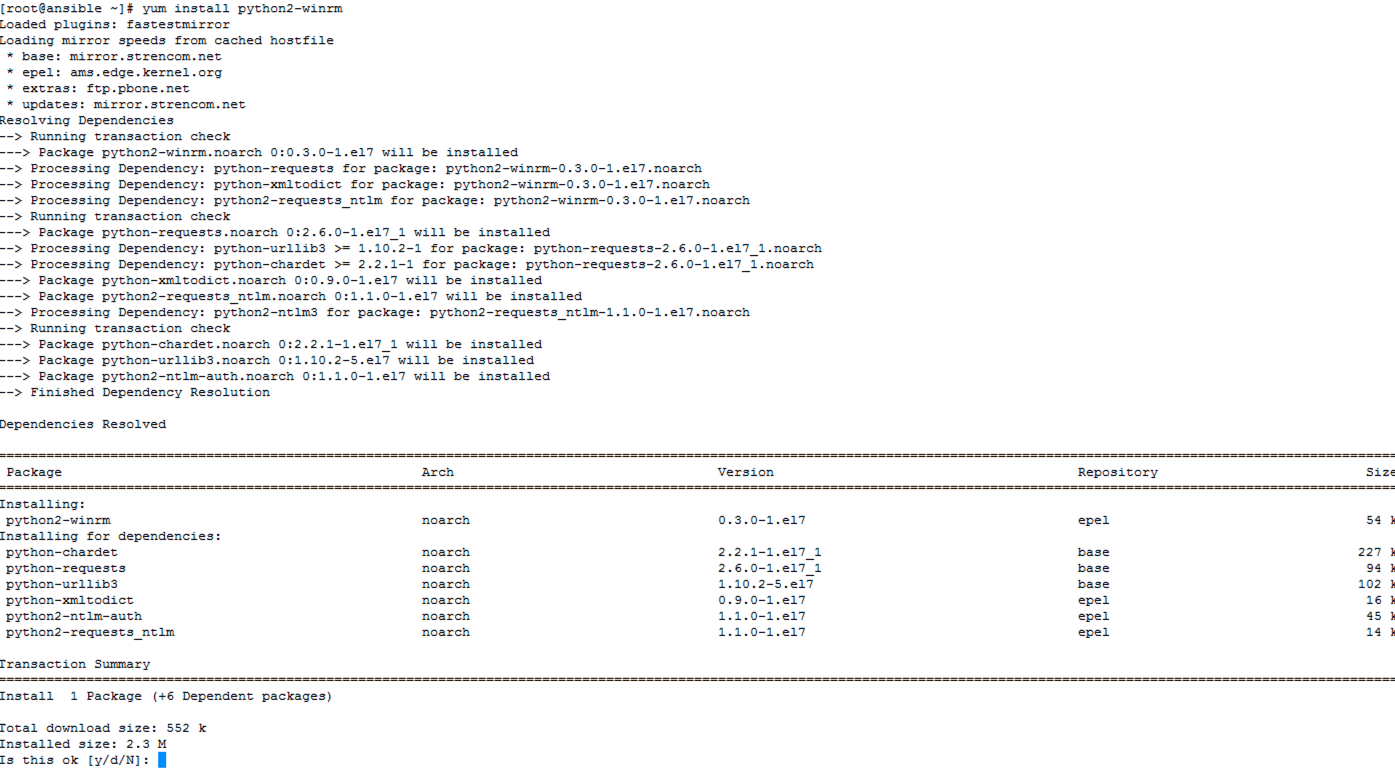 The first step is to make the Ansible server talk using this protocol which requires additional packages. Here I am using “yum” to install the “python2-winrm” pacakge and its dependencies (you could also use “pip” to install “pywinrm”).