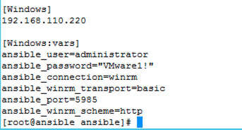 Here’s a section from my “hosts” file in “/etc/ansible”. As well as a new group (called “Windows”) I have also added a variables section for the group (“Windows:vars”) to allow me to provide the necessary settings to leverage WinRM.