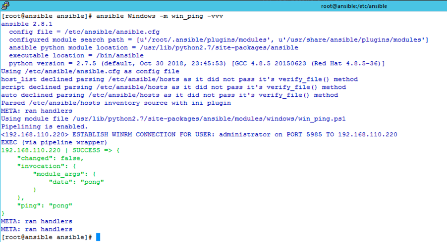 If you remember my previous article when the Ansible platform was first stood up (https://vnuggets.com/2019/07/04/ansible-getting-started/(opens in a new tab) I used an Ansible ping mechanism to verify all was working ok between the Ansible server and a client machine. There is a similar method for Windows called “win_ping”. Here I have used it with the -vvv option to output any error messages.