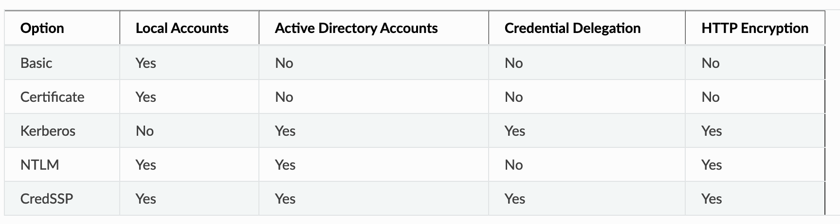 Not all authentication options are valid for a given environment. Ansible has a useful table on their website which covers when you can and can’t use each option which I have copied here (the original is located at https://docs.ansible.com/ansible/latest/user_guide/windows_winrm.html#winrm-encryption).