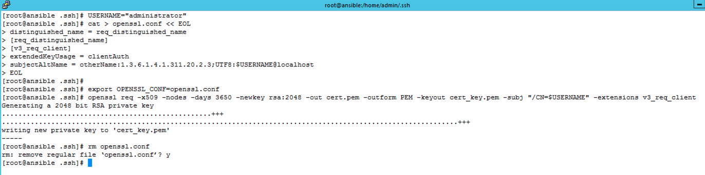 First of all I need a Client Certificate for the Ansible server. I’m going to use OpenSSL to create a self-signed certificate (alternatively you could import a CA signed public and private key rather than use this process for self-signed). The following is copied directly from the Ansible website and creates a certificate request configuration file for the client certificate that contains the username in UPN format as a SAN entry. The file is then used to make a request for a self-signed certificate which outputs the public and private keys.