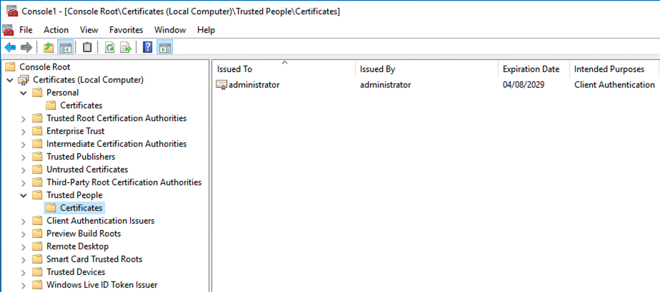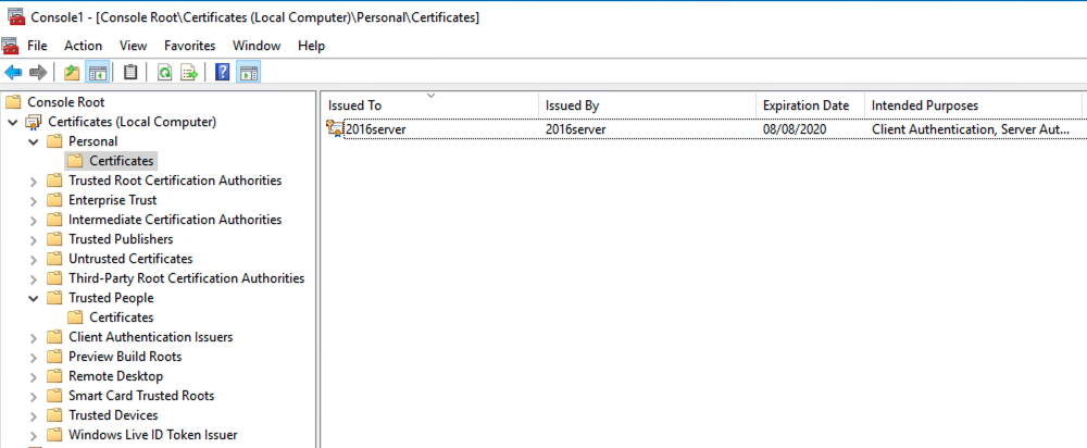 If you want to use a CA signed certificate rather than the self-signed certificate then the certificate itself should be placed into the “Trusted People” store and the CA issuing certificate placed into the “Trusted Root Certification Authorities” store.