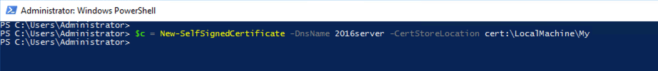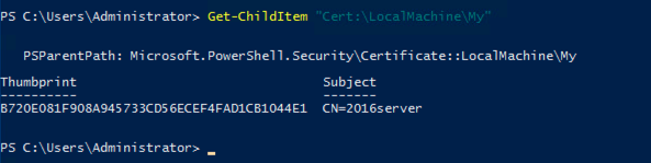 In my environment I have no enterprise CA so I am going to generate a self-signed certificate and install it to the Local Machines personnel store. My 2016 server does not have IIS installed on it so I am going to create this certificate via PowerShell using the “New-SelfSignedCertificate” cmdlet.