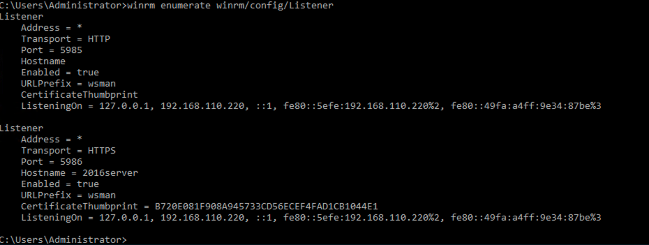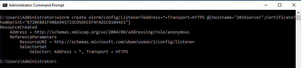 Next the listener is created using winrm. I choose to use a standard command prompt for this rather than PowerShell as the syntax is slightly easier. My copied thumbprint value from the above output is added to the command.