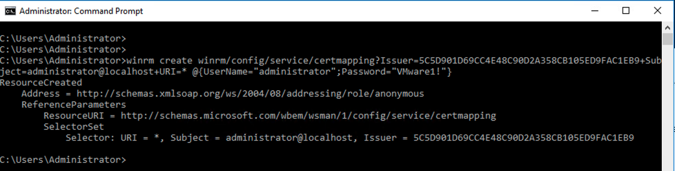 Once the Listener is in place I then need to tell WinRM which user to map the certificate to. In reality what I am doing is mapping an expected SAN entry value (i.e. the username in the client certificate SAN attribute) and the thumbprint of a trusted issuing authority (i.e. the authority that needs to have signed the client certificate) to a set of credentials on the windows server.