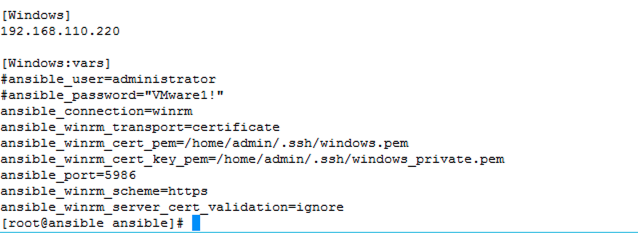 The last piece of the puzzle is to add the necessary variables to Ansible so that it knows how to communicate with the Windows 2016 server. I have commented out the user and password variables I was using for basic authentication, changed the transport method to certificate, added the public and private keys to the client certificate, modified the port number to match the HTTPS Listener port, set the scheme to HTTPS from HTTP and finally added a variable to ignore any certificate validation errors (as I’m using self-signed certificates).