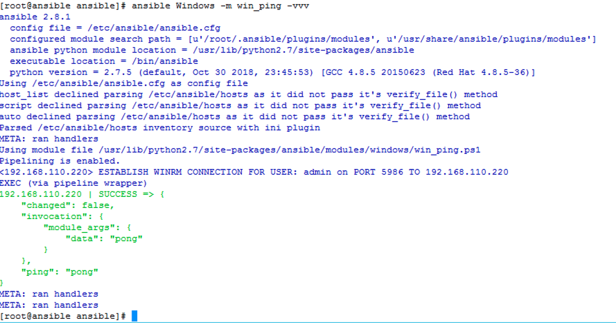 Now I can run a new test ping to verify I can still authenticate to the Windows 2016 server. Note that the user in the debug output displays as “admin” however this is just because “admin” is defined as the default user for remote connections.