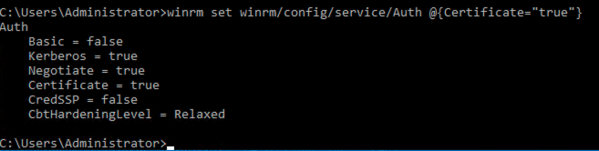 Despite having a certificate installed and a user mapping I still need to tell WinRM that it can use certificates to authenticate users. To do this I need to set the certificate option from false to true and disable “Basic” authentication if it is still enabled (here I have already disabled it but you can use the same method to disable it if needed).