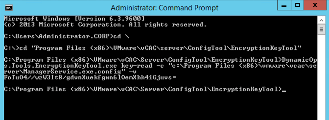 "C:\Program Files (x86)\VMware\vCAC\Server\ConfigTool\EncryptionKeyTool\DynamicOps.Tools.EncryptionKeyTool.exe" key-read -c "C:\Program Files (x86)\VMware\vCAC\Server\ManagerService.exe.config" -v