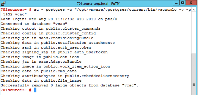 su - postgres -c "/opt/vmware/vpostgres/current/bin/vacuumlo -v -p 5432 vcac"