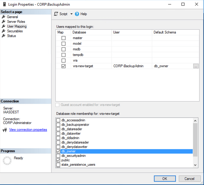 Once the database has been restored make sure the service account you are using in the new vRA target install has db_owner rights. You can do this by either assigning the correct account as “Owner” from the database properties or by mapping a new account to the restored database as follows: