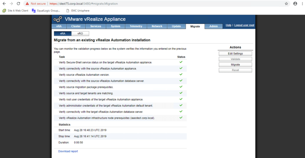 Before you can run the migration you must first perform an input validation which enables the target vRA install to verify that all your provided input is correct. If everything passes then you should end up with all green ticks as mine does below.