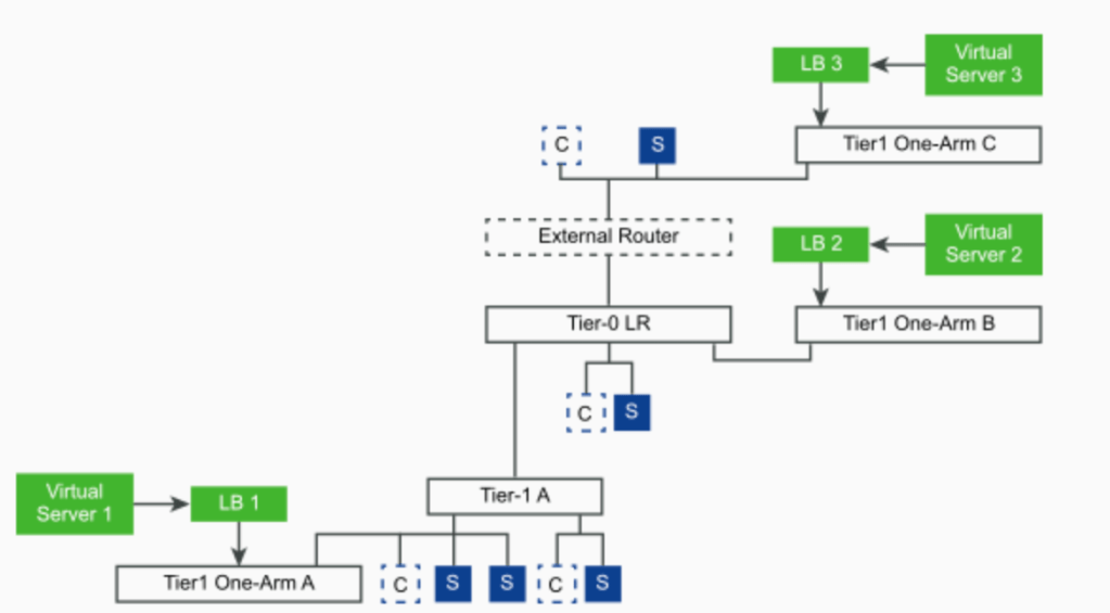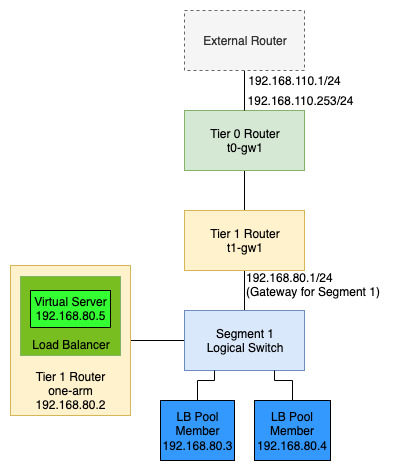 Normally when you deploy a Tier 1 Router you link it to a Tier 0 to allow routing to and from the outside world as well as any other segments and Tier 1 routers in the environment. For a one-arm configuration you need to deploy a Tier 1 which is NOT connected to any Tier 0. In other words it is a standalone Tier 1 router. This allows the stand alone Tier 1 to be connected to the same network segment (in the same subnet) as the pool machines you wish to balance connections to whilst deferring routing to an existing Tier 1 router (connected to the same segment) that in turn is connected to Tier 0.