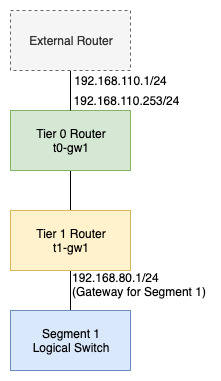 My starting configuration has a segment/logical switch named “Segment1” connected to a Tier 1 gateway called “t1-gw1” using a subnet defined as 192.168.80.1/24. This Tier 1 is advertising all routes for connected segments, vips etc. and gives basic networking capabilities for any machine connected to the segment. Anything I deploy onto “Segment1” can route out onto the external network (BGP config in place on “to-gw1”).