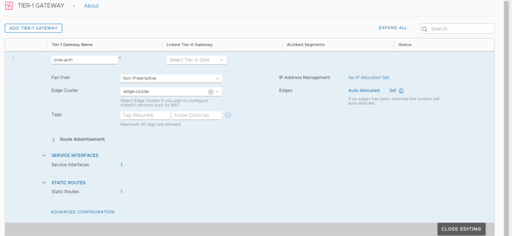 To deploy a one-arm load balancer I am first going to deploy a new Tier 1 (called “one-arm”) which looks like this. Notice the Tier 0 is NOT populated.