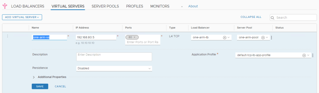 The final step is to then create a virtual server for the load balanced service and link it to the load balancer. The IP address needs to be in the same subnet as the pool members (in my example I am using 192.168.80.5 pointing to pool members 192.168.80.3 and 192.168.80.4).