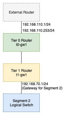The starting network configuration taken from the above diagram will be External -> T0 -> T1 -> Segment2. This is utilising the same routers as I did in part 1, this time with a new segment (“Segment2”) and associated subnet for the pool of load balanced machines to connect to.
