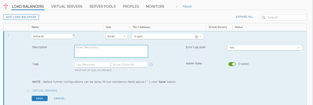 To start setting this up I don’t need to deploy any new Tier 1 routers as my basic Tier 1 “t1-gw1” already exists and provides routing for a number of other network segments. Instead I am going to define a Load Balancer on “t1-gw1”, adding the service to the existing configuration.