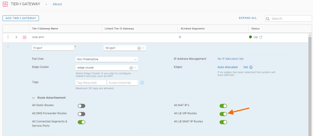 The Load Balancer and associated Virtual Server are now configured and should be serving traffic however it is always worth validating that your Tier 1 is configured to advertise Load Balanced VIPs.