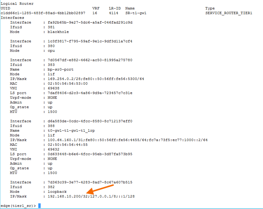 You can also check the configuration of the Tier 1 router from the command line by connecting to the edge node and selecting the Service Router for the Tier 1, in my case VRF 16.