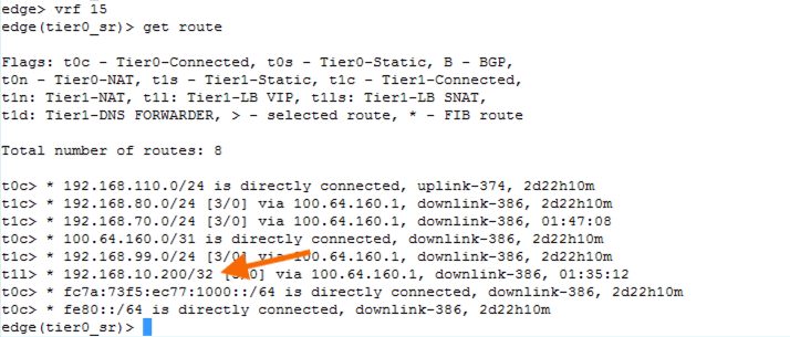 Changing to VRF 15 (the Service Router for Tier 0) should show me a route to my Virtual Server VIP.