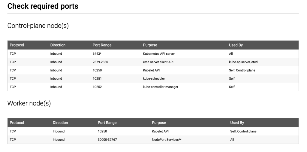 The required inbound ports are listed on the Kubernetes website (here). They are as follows (control plane node = master node):