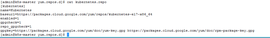 This repository file is created in “/etc/yum.repos.d” which I have called “kubernetes.repo”. This should also be done on all 3 hosts.