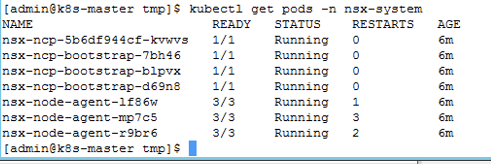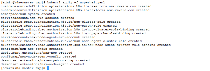 Now that my configuration (yaml) file has a basic setup within it. I can use the file to deploy NCP using “kubectl” on the machine running the master Kubernetes role. Note this only has to be done once from the master (in my case “k8s-master”), not on all 3 machines!