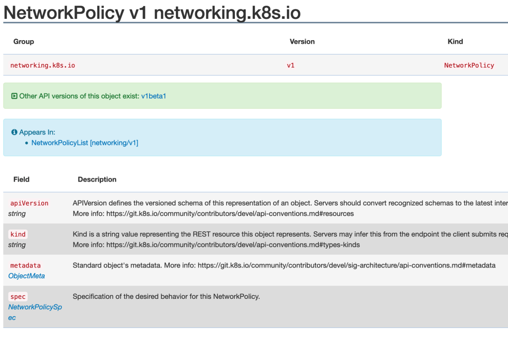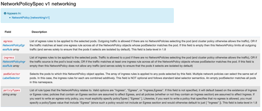 The lions share of the configuration needs to be placed into the “spec”attribute. Going back to the API guide for a network policy and clicking on the “NetworkPolicySpec” link reveals that there are 4 possible attributes that need to be provided (ingress, egress, podSelector and policyTypes).