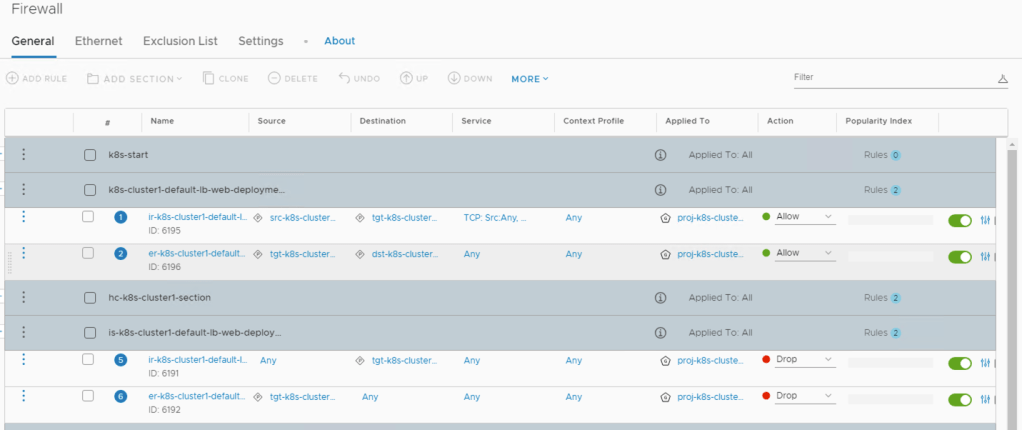 The output of this are two sets of rules created within the distributed firewall. The first set of rules allow traffic in and out of the PODs on the TCP protocol as specified in the manifest file. The second set of rules makes sure that all other traffic in and out of the PODs are denied.