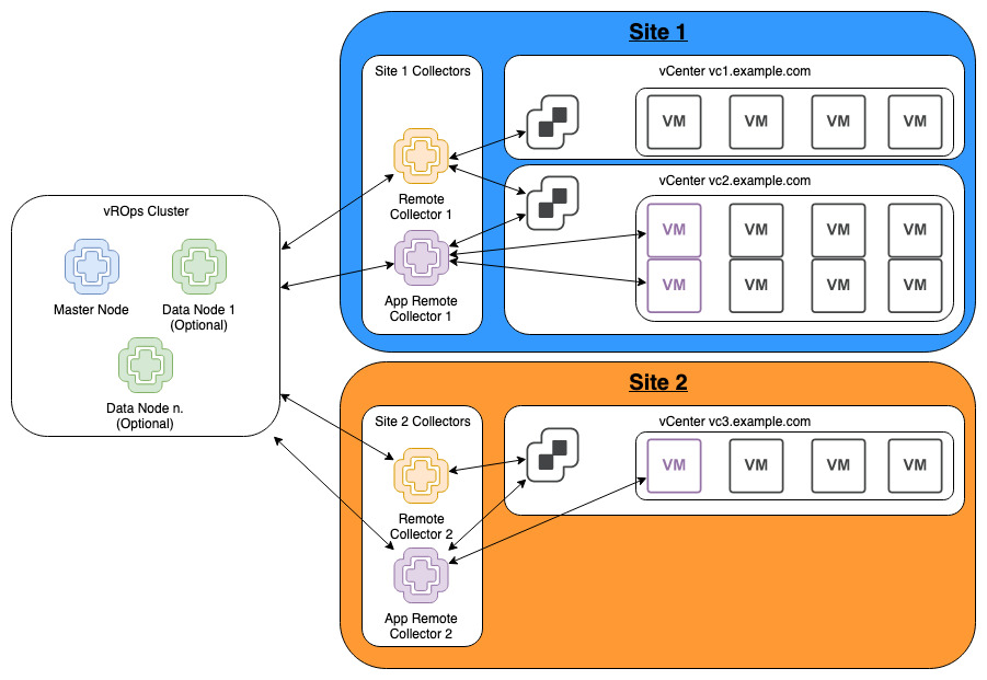 In Site 1 I have 2 vCenter appliances, each managing their own set of clusters and VMs. vCenter 1 has no requirement for application level monitoring of its virtual machines where as vCenter 2 contains some VMs that do require it. In Site 2 I have a single vCenter appliance which also has some virtual machines that need application level monitoring.