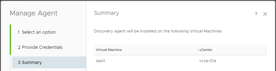The agent configuration is handled on a separate tab to the “Service Discovery” configuration however the process is mostly the same to enable the agents. The idea is too highlight one or more VMs that you want to deploy an agent on, select deploy and then provide some configuration information. In this example I am configuring a machine called “iaas1”.