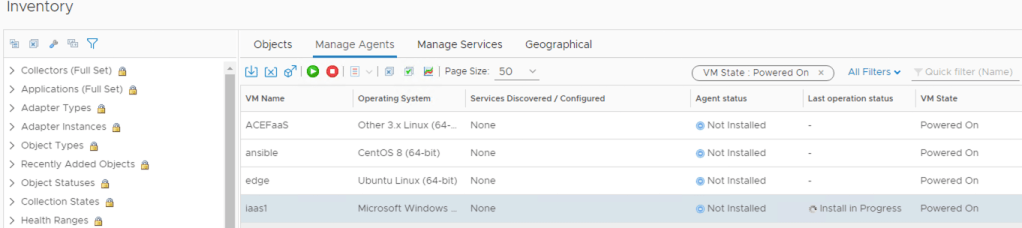 The agent installation process now starts for my “iaas1” VM. Any installation errors that you encounter will be flagged up here in the “Last Operation Status” column.