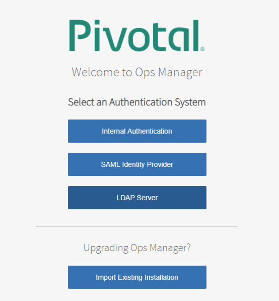 Once Ops Manager has finished deploying and powered up the web interface should be available (via a HTTPS connection). You cannot do anything until authentication is setup comes so I need to select one of 3 authentication mechanisms to get into the product.