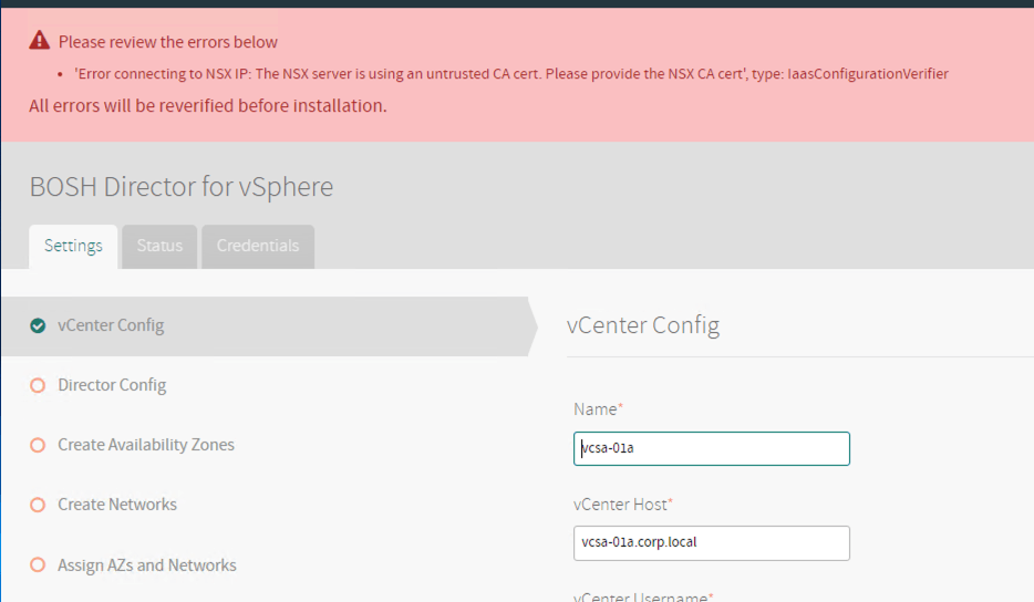 Part of this configuration enables you to provide NSX-V/T manager connection details including a username and password. When I first tried this I saved the screen to move to the next stage however an error resulted as shown below. This appears to be a known issue where the self-signed cert that NSX Manager uses is not secure enough because the issuing authority is not trusted.