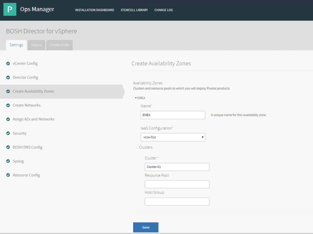 With Ops Manager each Availability Zone is defined as a collection of one or more vSphere clusters. For example, 2 clusters that reside in the same physical rack might be regarded as within the same Availability Zone if they are serviced by the same power, switches and storage. In my environment I only have a single cluster so I only have one Availability Zone.