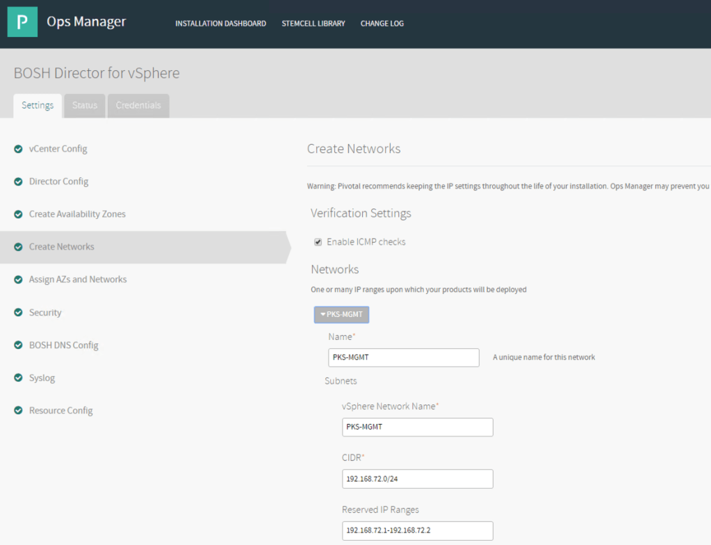 The Networks you define in BOSH Director are the ones you want BOSH to use when deploying VMs (in this case PKS). In my install I am adding the “PKS-MGMT” NSX-T logical switch which Ops Manager is sitting on along with the network address and any IPs from the network that BOSH cannot use (i.e. the default gateway and the Ops Manager IP address in my case).