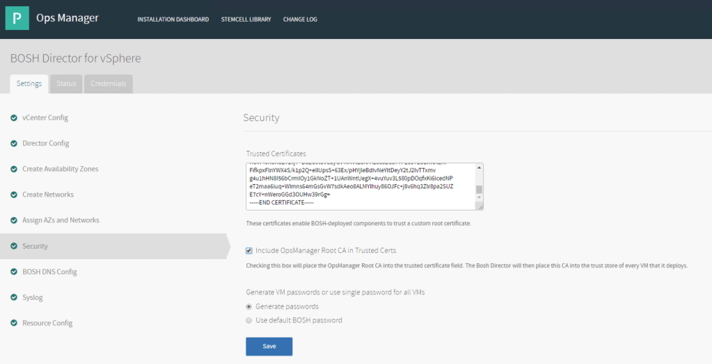 As I have a MS CA in my environment for issuing certificates I have added this to BOSH so that any VMs that BOSH deploys will automatically trust certificates issued from this CA. I have also set BOSH to generate and store unique passwords for everything that requires a password.