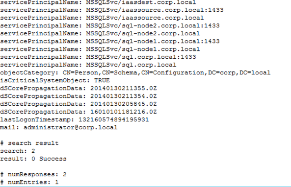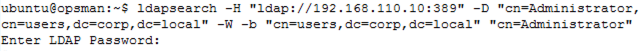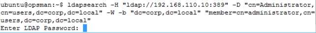 Here I am using the “Administrator” account to bind to the directory (make sure you use a proper service account!), searching in “cn=users,dc=corp,dc=local” for a user that has a common name of “Administrator”. This is the equivalent of using a cn={0} filter where {0} is automatically substituted for a name to search for by Ops Manager.